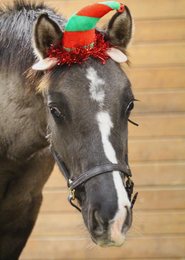Once the barn was decorated they got to try on their outfits for next week’s “formal” Christmas shoot. We figured we’d do one more themed Foal Friday post/photo shoot for them, especially since next week’s falls on Christmas Eve. Couldn’t resist the occasion! So out came some hats.