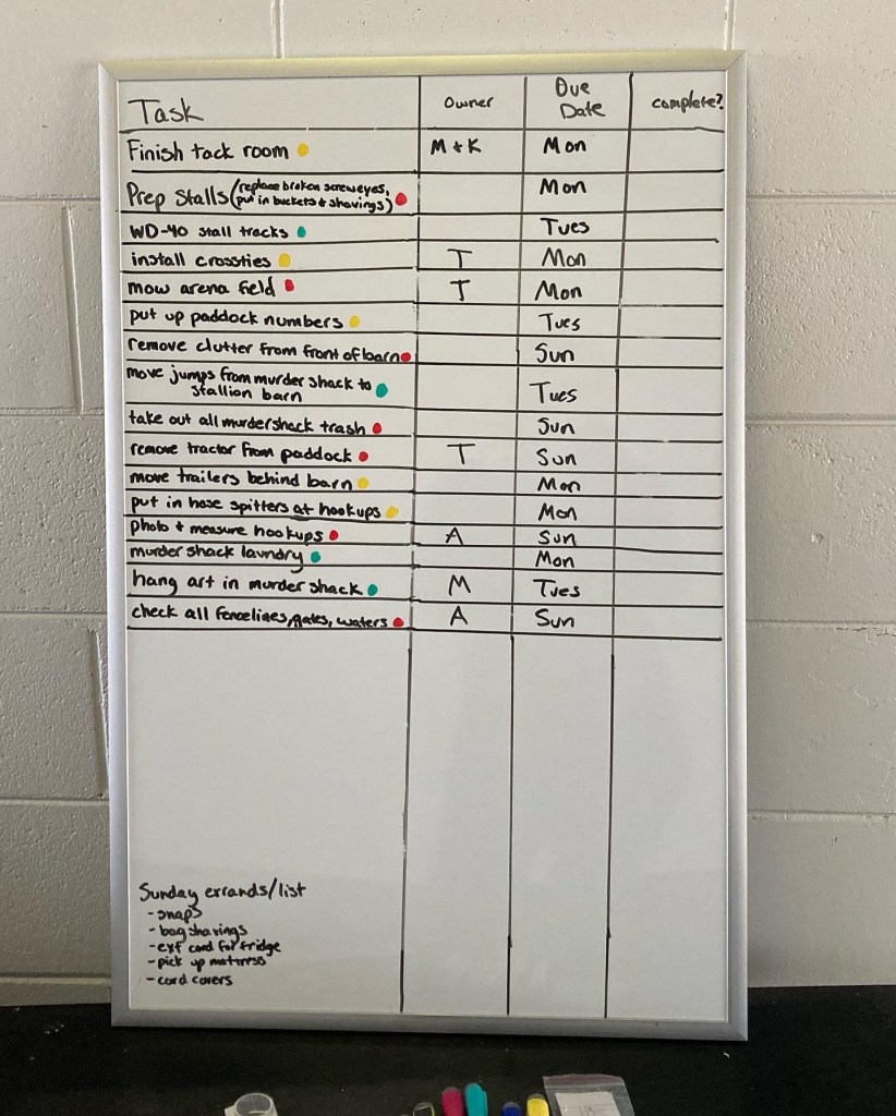 Once I felt confident that everything was accounted for and organized and we all knew what needed to be done for the day, I left Michelle and Kelan working on the tack room (they’re good decor and design people, definitely not my strong suit) while I went to run a few more errands and get a few more things that we had discovered we needed. When I got back I hit the ground running, trying to knock the most important tasks off the list first because Megan (other Megan… Presto’s trainer Megan. There are way too many Megan’s in my life, including myself.) was set to arrive from Pine Top with a couple horses that afternoon. The rest of her crew and clients would arrive on Tuesday.
