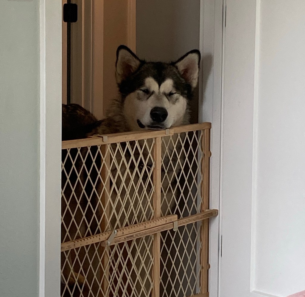 Mina is a bit scared of them, which is fair considering they’re 3x her size, but luckily I thought to bring the baby gate. Mina likes to stand on the bed (the safe place, clearly) while Obi stands in the doorway and wonders why she won’t come out and play with him. It’s working out just fine though… Mina comes outside when we’re outside, and when she’s inside she just sleeps on the bed. Not much different from her normal routine really.