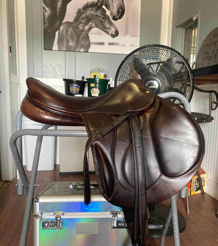 My original plan was to keep an eye out for one similar to Hillary’s but with a more forward cut flap. I’m kind of borderline between forward and extra forward, but if I shorten my stirrup much more at all, I end up with my knee on the block. At Kentucky I was able to sit in one that had the more forward flap and confirm that yep, that was the spec I needed. I got the contact number for the local Voltaire rep and was going to get in touch with them when I got settled here in Florida to see if they could find me a used one.