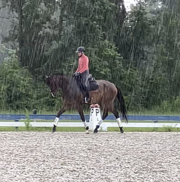 Which, poor dude, it started raining like the second she got on, and got increasingly more torrential as she went. I thought Presto might have a bit of a meltdown but to his credit he didn’t, he stayed on task and they had a quick but productive ride. Steph immediately remarked that he already was going better than he had last week (I can execute homework, that’s one of my few talents). She played around with a few things to see what was most effective for him and was definitely able to feel even more than she had seen. Plus she really liked him, which of course it’s always nice when a professional thinks your horse has a lot of potential.