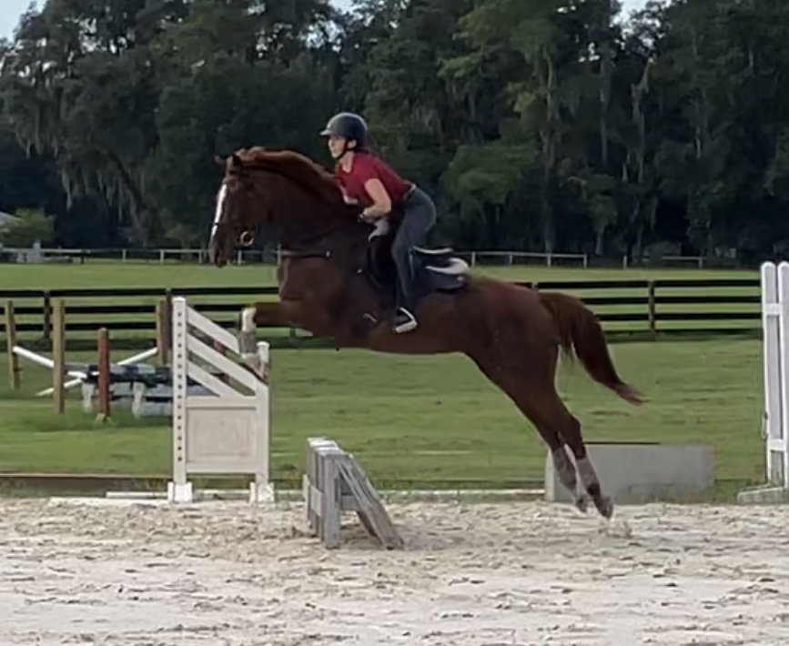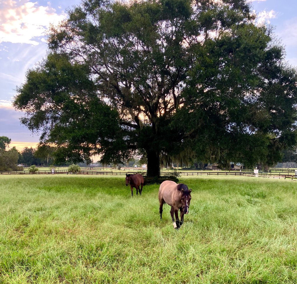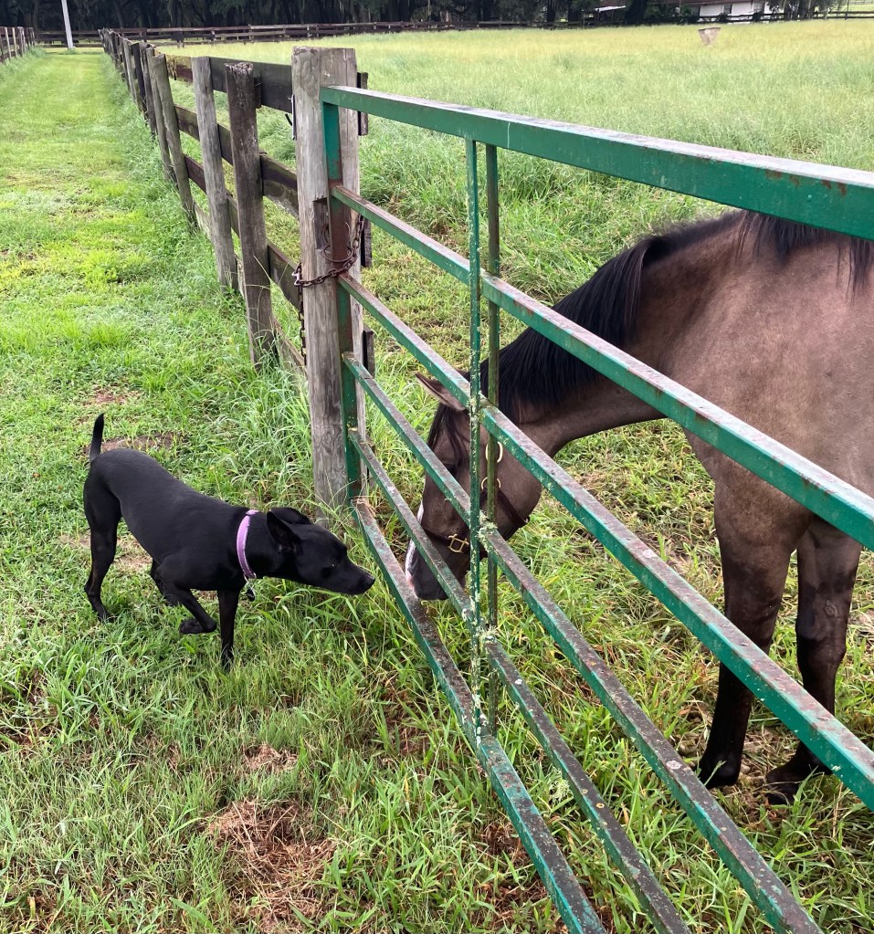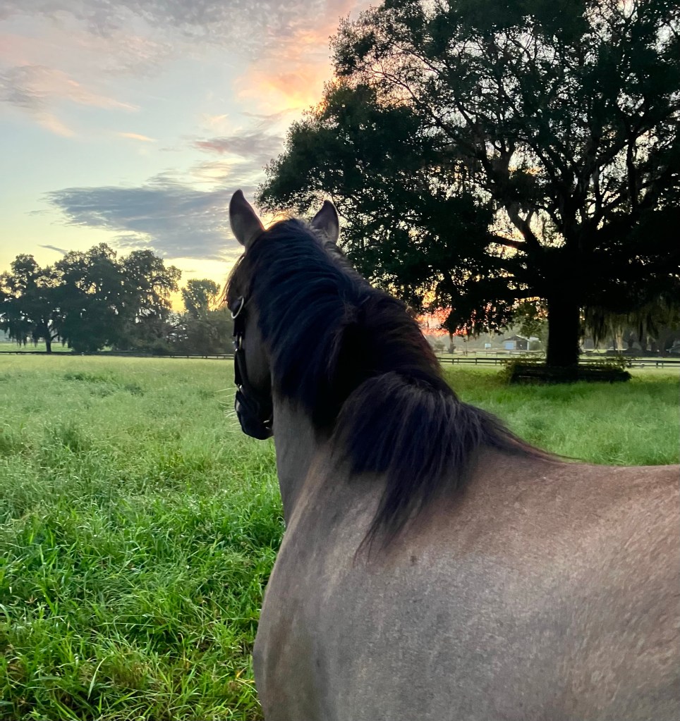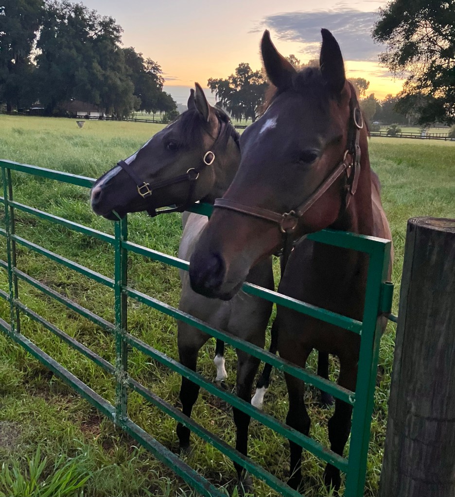 It’s a short hack from the parking area to the XC field at Magnolia Sands, and we let Gemma lead the way since I’m not sure if I’ve ever mentioned this but Captain Chaos tends to cause Problems even when there aren’t any. If you let him lead he will 100% pretend to spook at things just because he takes extreme glee in watching other horses scatter and participate in Fuckery with him. So… Presto doesn’t get to lead.