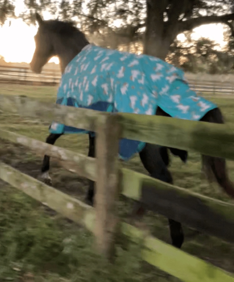 In Florida news, it is for some reason cold AF this morning, which is the only reason why you’re getting this post. I’m not riding until it warms up because I don’t have a death wish. When I went out to feed this morning Presto was levitating around his paddock snorting like a dragon, which was in sharp contrast to the unicorn pajamas he’s wearing.