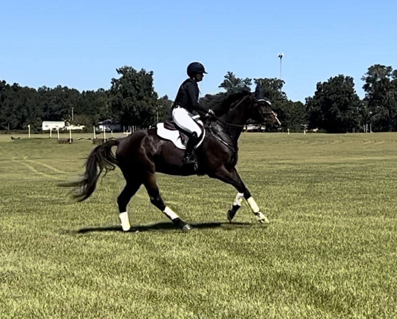 The rest was just basically coasting on autopilot. I pointed him at it, and he jumped it. It was easy. I didn’t have to do a whole lot besides keep him balanced and straight. I did kind of forget that Novice speed is slow and you don’t have to ride routes that save ground, so we were almost too fast (errybody be out there circling LOL) but just squeaked in there for a double clear. I had not worn a watch because I didn’t want a distraction.