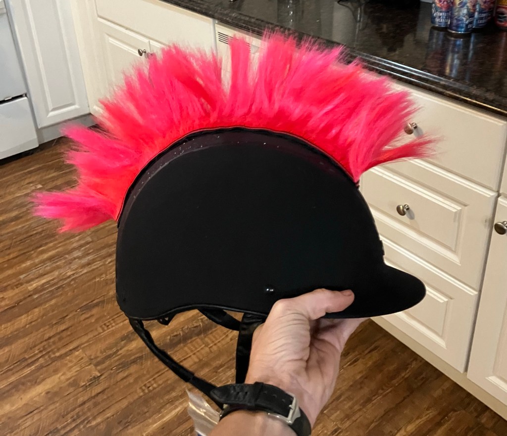 And I made some anarchy symbol stickers to go on Presto’s saddle pad too. Because he IS walking anarchy, really. Hillary also picked me up some hot pink hair spray so that I could do the tips of his mane and tail in pink to coordinate with my mohawk. He already wears spiked browbands on both of his bridles, so that was really all he needed.