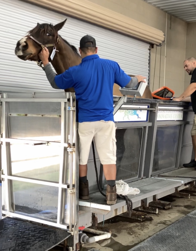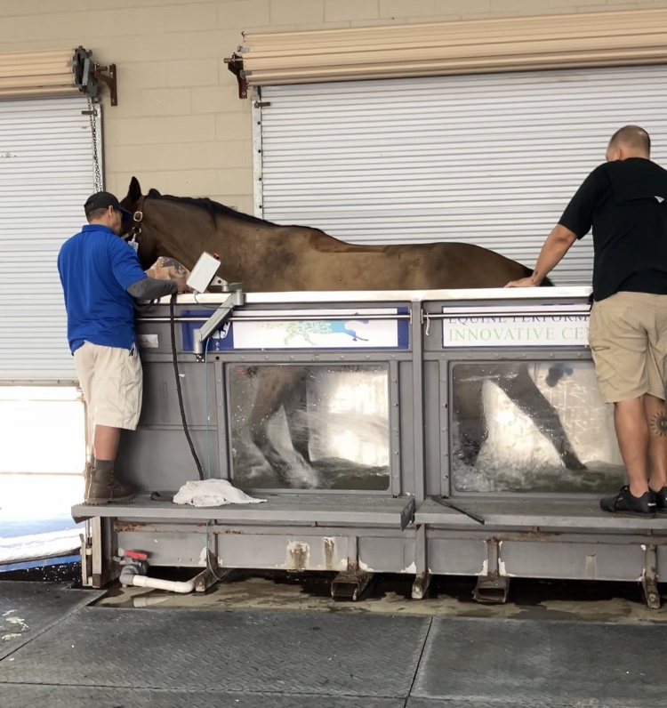 For the first session they gave him some light sedation to introduce him safely to the machine, and slowly let in the water, only bringing it to about mid-cannon. Next time they’ll work it up to his knees, and then finally to just below his belly. They do it slowly though to make sure the horses are comfortable and understand what it’s all about. They’ll also gradually work up his time in the machine so that it’s not overly fatiguing. It’s a really nice place so I’m very interested to see how it goes.