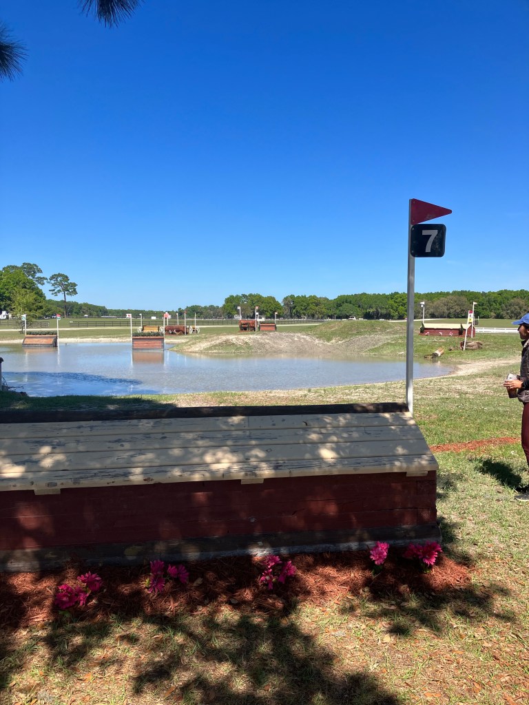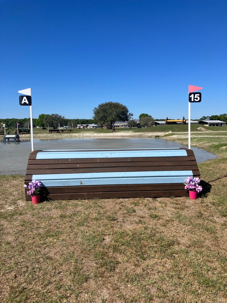 After that it was a bench and then (you’ll never guess) another combo. This time at the second water. There was a wide house (they call it house – it was wide enough to fall into the table category IMO) at the edge of the water, and then a 90 degree left turn to a smaller skinny house on the mound edge out of the water. I thought this might ride a bit spooky, seeing as how they wouldn’t know they were going to land right on the water line until their front feet left the ground. Also where they would put their hind feet to jump the B element was still quite down at the lip of the water, so you’d have to really keep the power up to that one since it would require a lot more jumping effort from the horse than just the size of the jump itself.