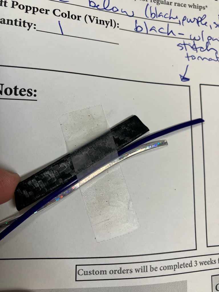 I’m excited to see how it turns out because it took a lot of debating for me to choose. I don’t like color very much but also just a black and silver whip is boring, so I was trying to figure out what color I could add to it that I wouldn’t hate. In the end I settled on purple, which was my mom’s favorite color. It’ll be black with silver glitter and purple thin stripes, a silver glitter spiral around the handle, and a black soft popper with purple stitching on the edges and a silver embroidered lightning bolt. Hopefully that’ll be distinctive enough to prevent it from walking away (or, uh, me losing it). I’m excited to see how it turns out!