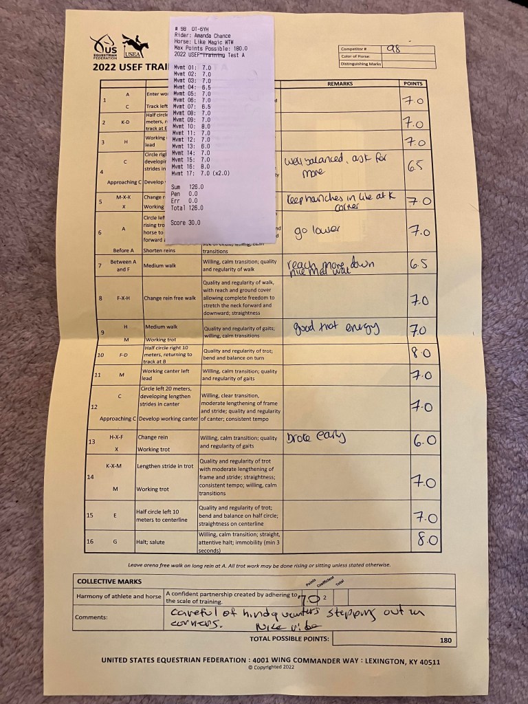 Which we did manage to accomplish. He stayed quiet and relaxed the whole way through (although he did take a strong peek over toward XC when we were trotting down that long side) but I definitely didn’t “go for it” at any point. I had a couple accuracy mistakes where I was just a step early or a step late for a couple of things, but otherwise he was quite obedient. Scores ranged from 6 to 8, with mostly 7’s, and comments about showing more (the judge was correct every time he said that, I didn’t show much of some things on purpose lol) and keeping Presto’s wayward hindquarters under control (yes this is my eternal struggle at this point in time with his training, he is a massive giraffe).