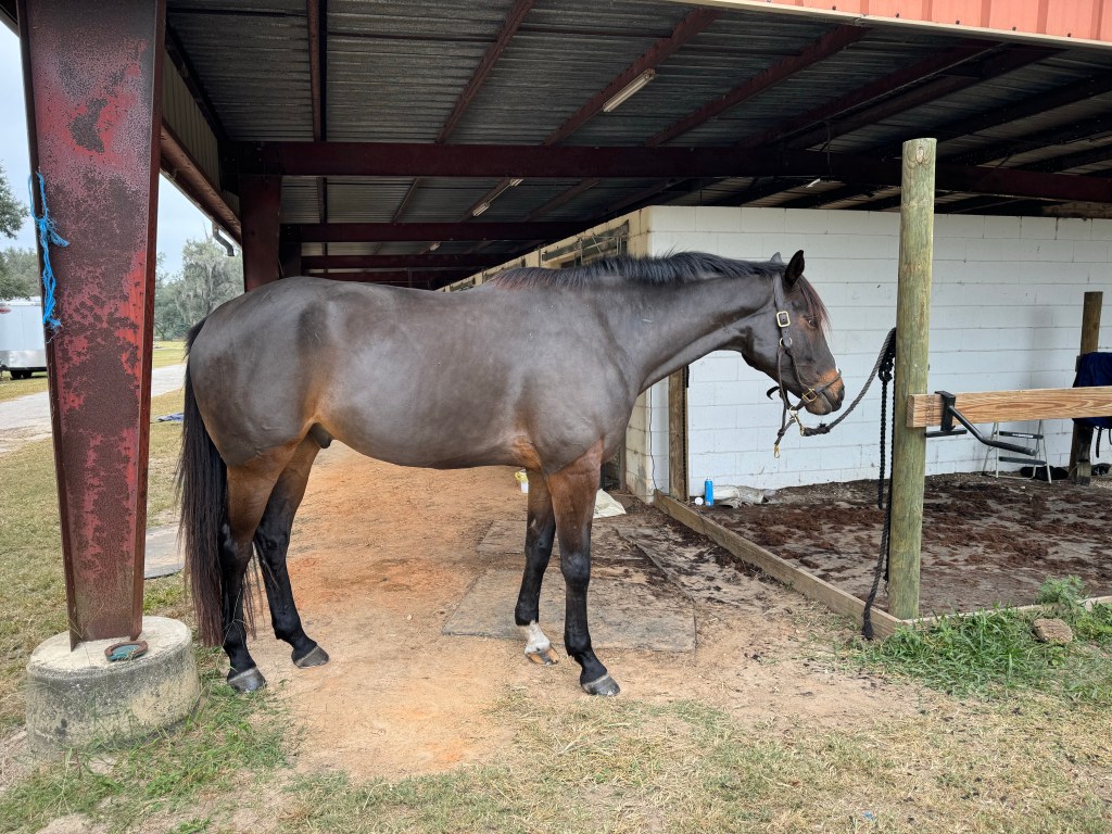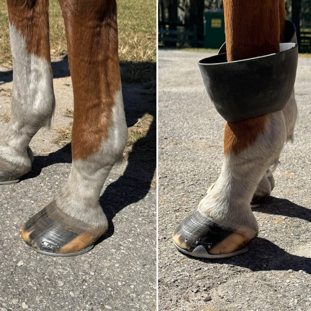 The before and after is just *chef’s kiss*. We’ve still got a little ways to go, but for one shoeing the difference is exceptional. No more aluminum racing plates – now he’s got some wide web steel shoes! He’s entering his SportyBoi era.