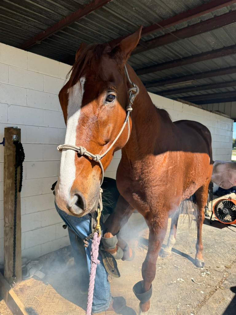 I’m still learning about Argo so I opted to hold him rather than put him in the crossties, but that definitely wasn’t necessary. Argo literally never moved. Not even when his feet started to smoke as his hot shoes were fitted to his feet. It’s pretty rare that we’d go ahead and hot-shoe one it’s first time being done off the track, but Argo was being so dang quiet we decided to try. And well… he didn’t care. Exceptional boy.