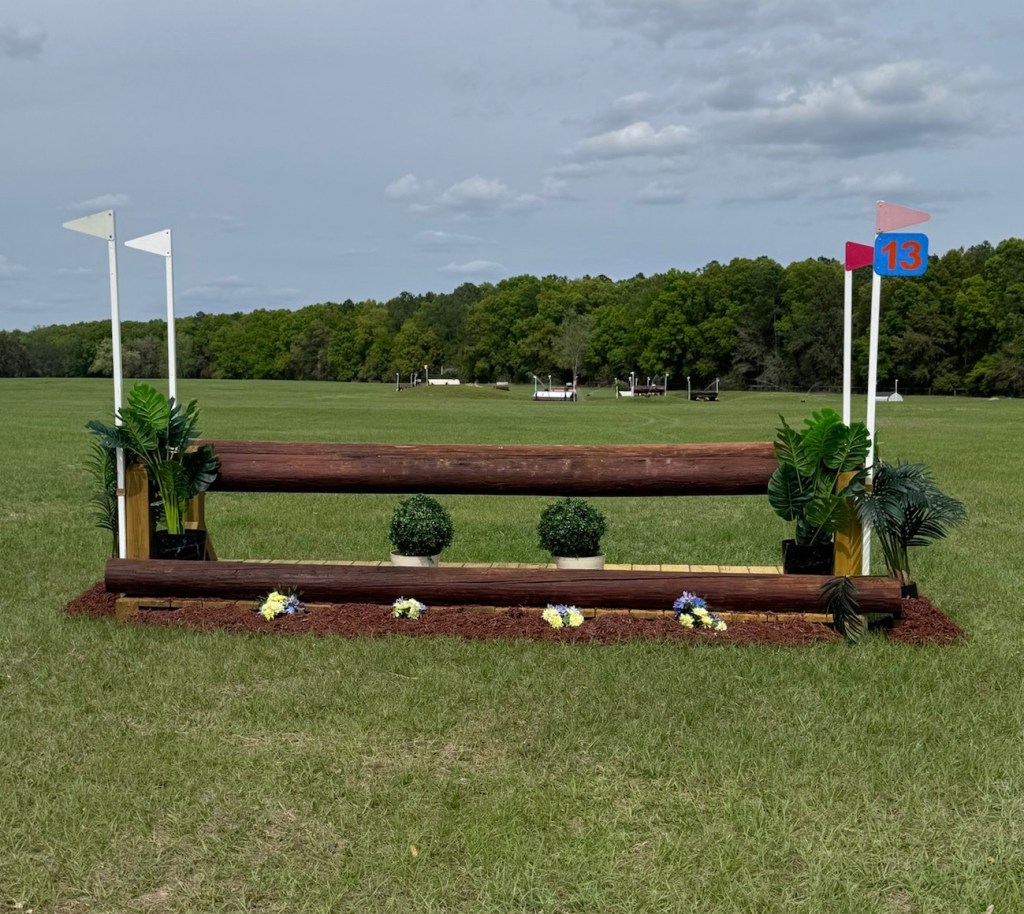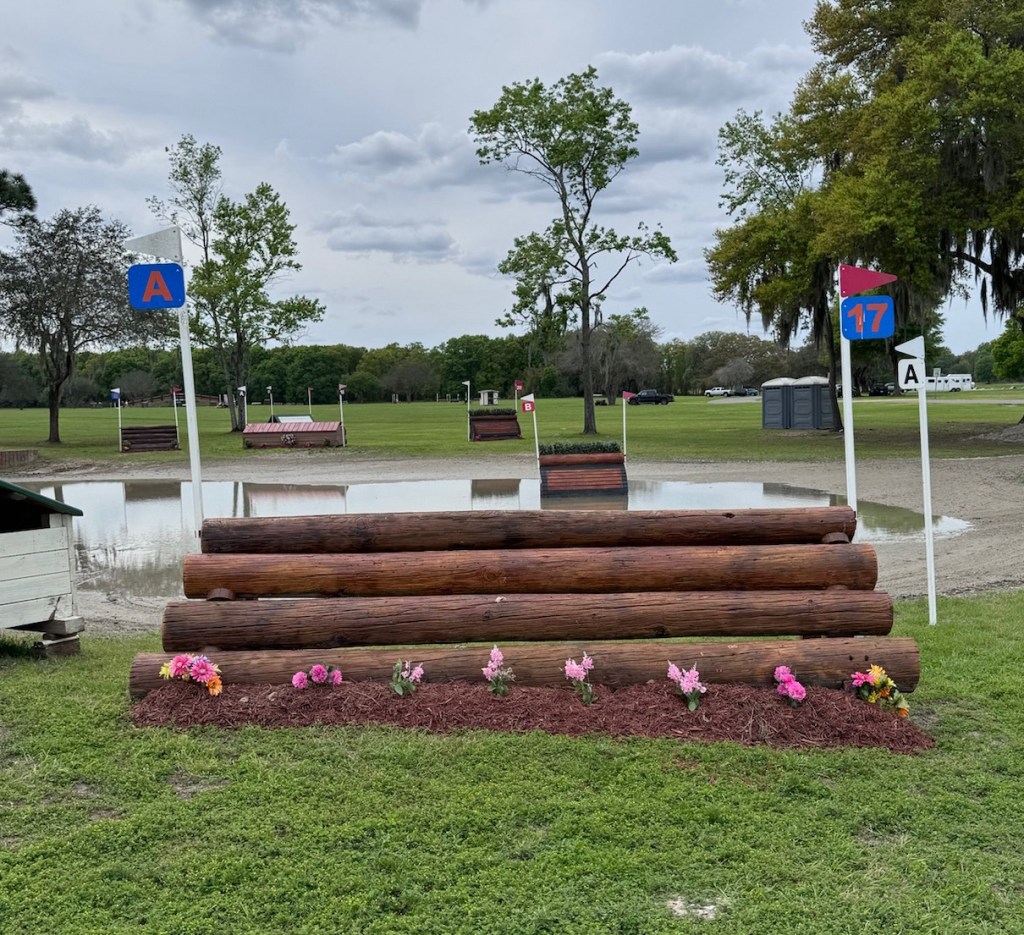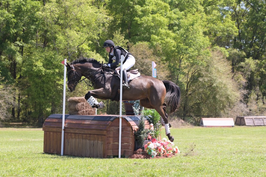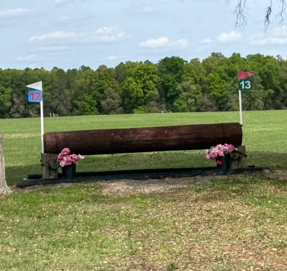 One thing helped me out a little bit here – there was a truck sitting in the trees to the left of the coffin, and as he took off at the rail he kinda slid his gaze slightly to the left. It worked out for me to get his focus to stay left, opening my inside rein over the ditch, and as soon as his feet touched the ground from the ditch I really closed my leg and was like THAT ONE OVER THERE, GO GET IT. His focus shifted to it immediately and he was superb over the skinny.