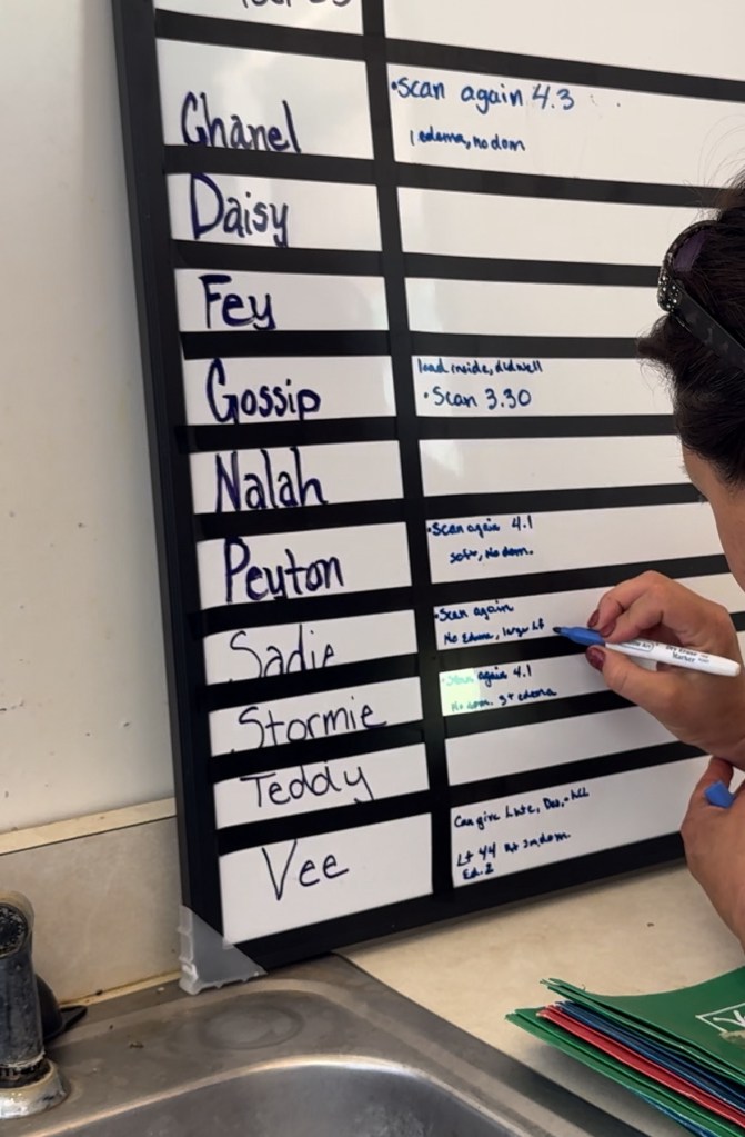 We haven’t actually scanned Fey yet, we’re taking the slow and positive route of getting her used to the stocks, the equipment, and all that stuff. Once they learn that the stocks are a good place (lots of cookies!) they’re much happier to come in and stand much better for all the scanning and stuff. The end goal is that by the time we actually scan her she’ll be happy and confident in the stocks. The less we have to sedate them, the better, obviously.