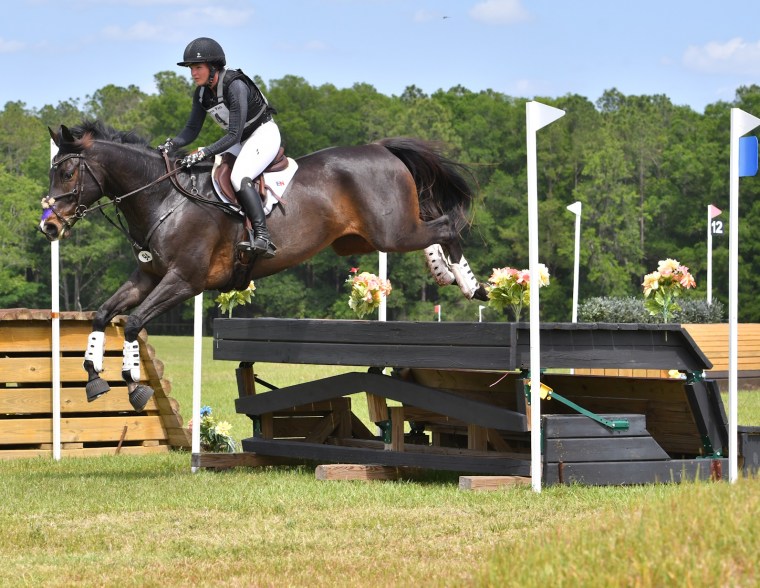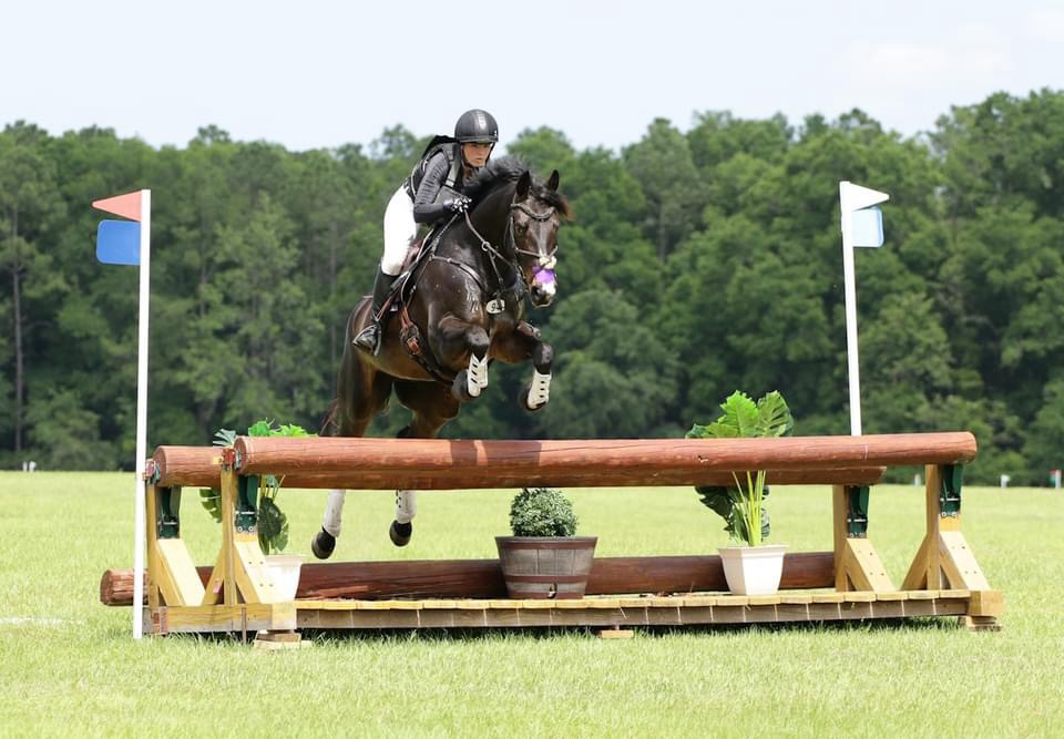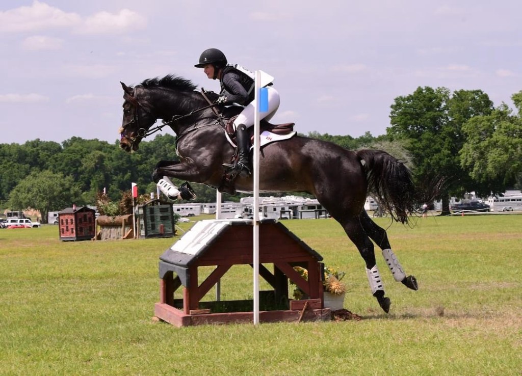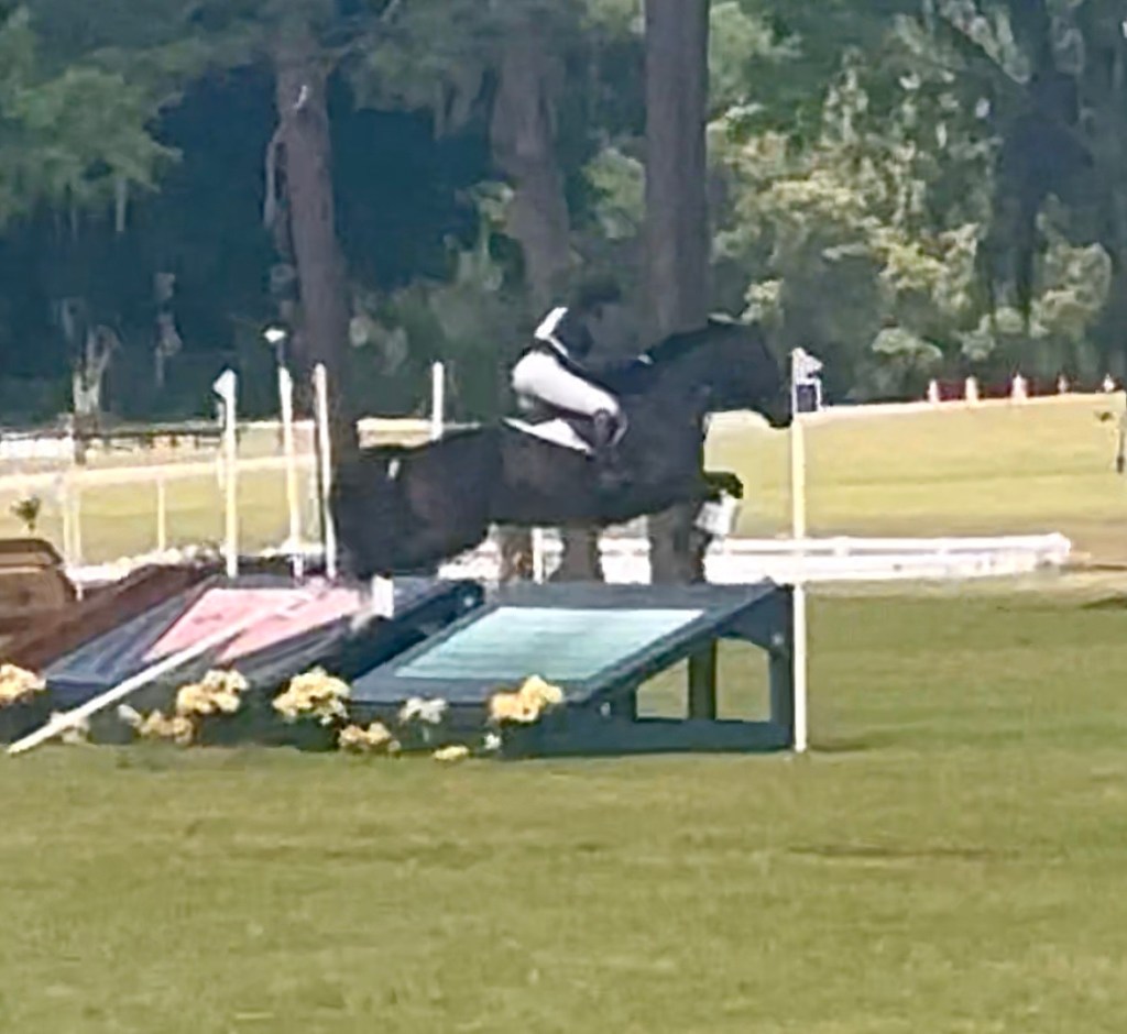 Fence 3 was the MIM oxer off a pretty short turn approach, but the turn works as the half halt, so you could pretty much just keep coming. He pinged over that great. As we got close to 4, the trakehner in the treeline, I could see the poor girl who had left the box ahead of me off to the side, no longer attached to her horse. I didn’t have any time to process it in the moment, but turns out the horse had fallen. Luckily Presto was too busy jumping the trakehner to give that horse much thought in the moment.