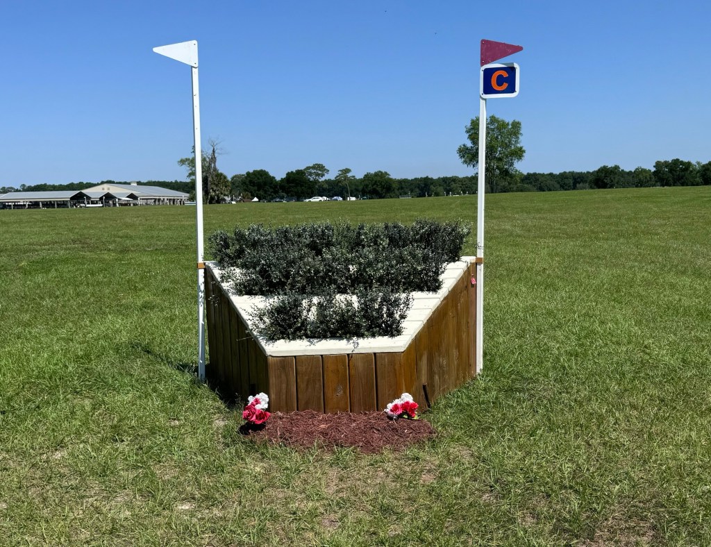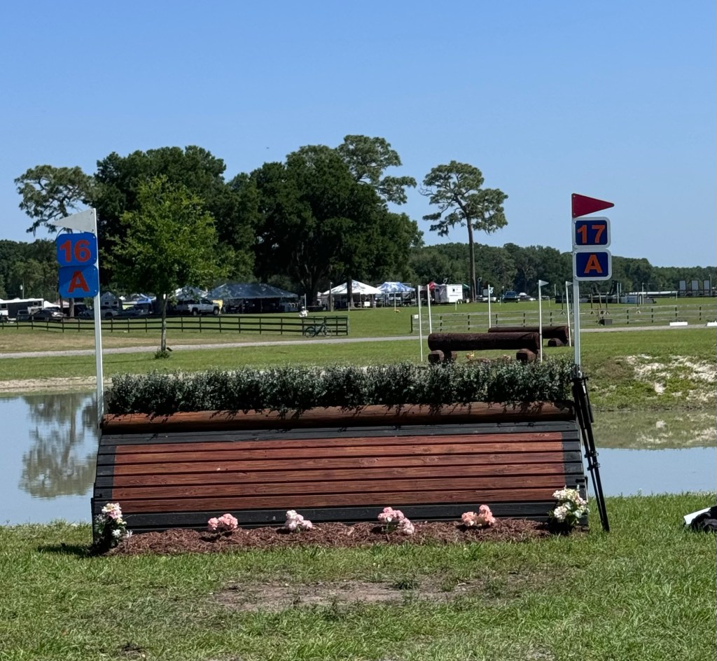 Then we got to the second water, which I thought might have been the most interesting question on the course. You had a fairly standard brush fence into the water, and then turned right and jumped a corner. Caveat being, there was a Training jump in the way of what would be the best line to the corner. So you could either cut inside of the Training jump and come into the corner on a bit of an angle, daring yourself a little, or you could go around the Training jump and make a quick 90 degree turn to jump the corner dead-straight.