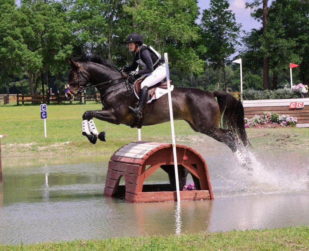 From there we went to the log wagon, which was good, and then to the first real question – a jump in the water, then a left turn to a bending line. I noticed while watching the day before that if you had a horse that tended to step into the very edge of the water, it was a perfect 3 forward strides to the rolltop. I happen to have a horse like that, so I knew once we got to the edge I could just close my leg and the 3 would come up well, and it did. The line to the next one seemed to ride best in a 6, then you could ride forward and the skinny was there in 3. Some people hung out/slowed down and did 7 and 4, but it definitely looked more awkward that way. Megan wanted me to take the bolder route, so we did. Presto was delighted, he’s a fan of taking bold and forward routes.