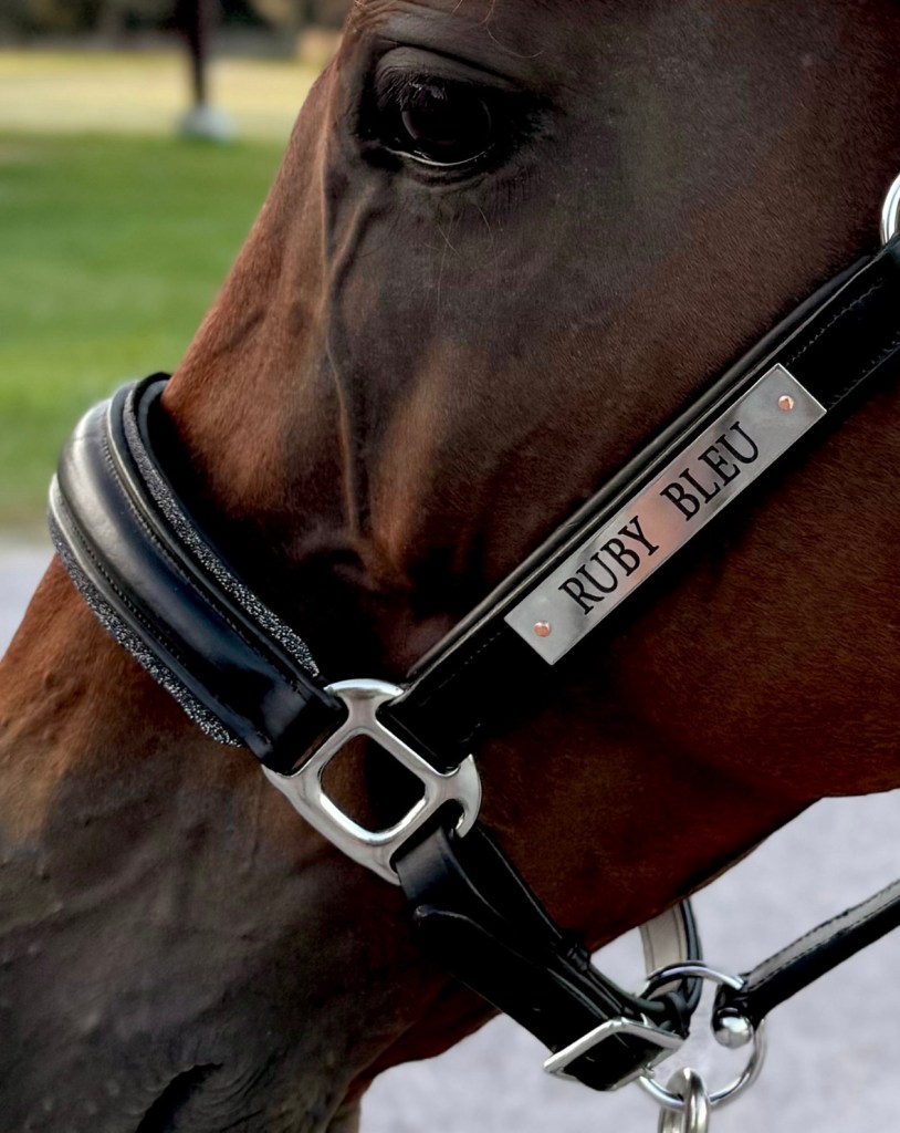 The noseband is silver and gray and blue crystals and it really adds a nice little touch of bling. I got the nameplate put on at Tack Shack, because I thought he needed to be officially official. 10/10 love it.