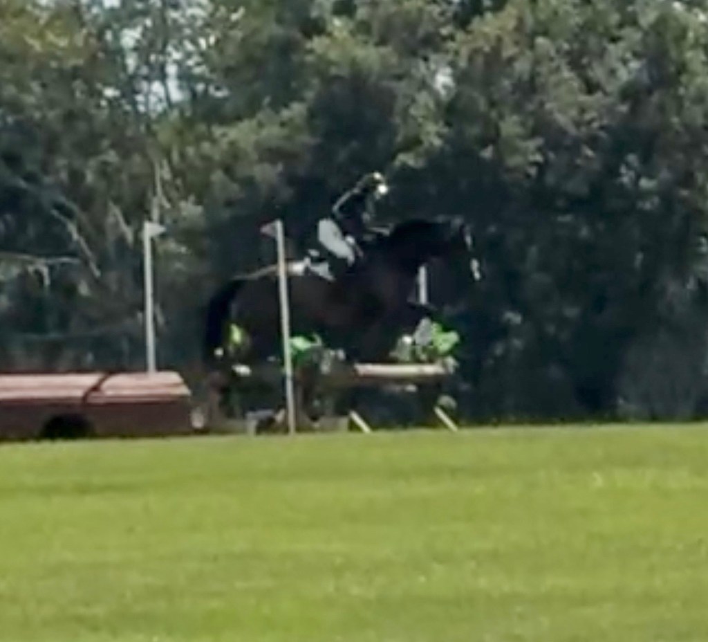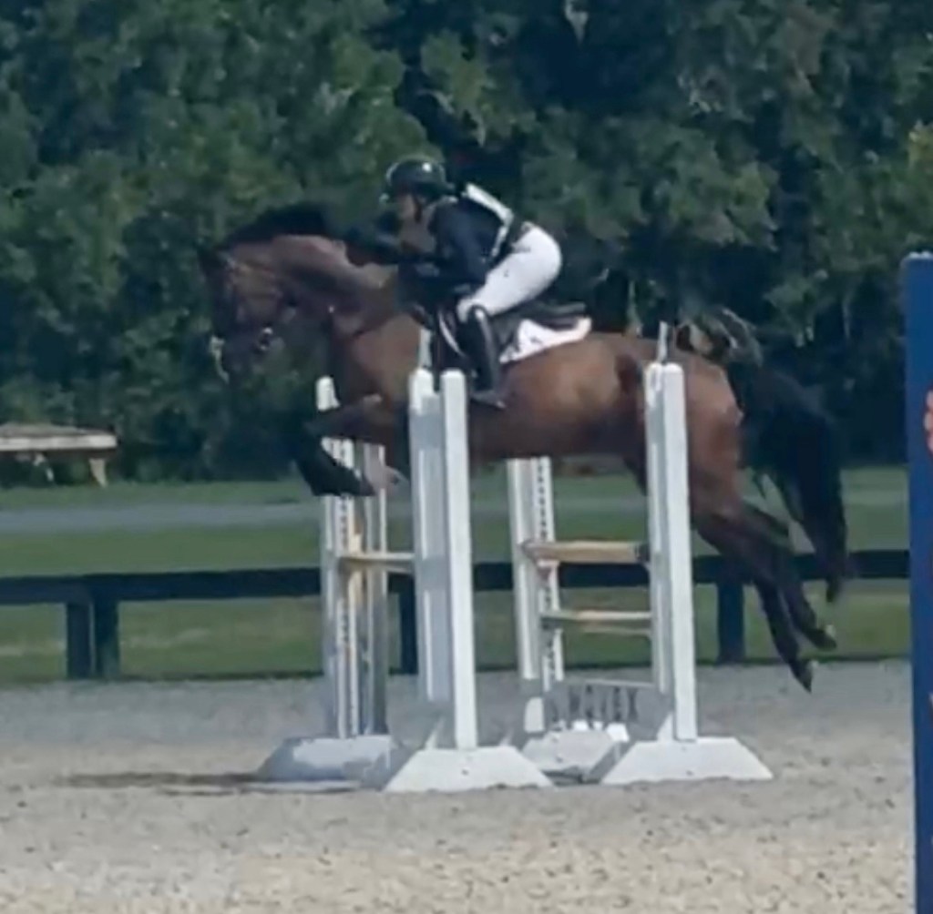 After that I had a couple hours til SJ, which was just long and hot enough to regret all my life choices. If I didn’t really need the showjump practice I would have gone home, but… I do need it. Presto doesn’t really, but I do. He was set up in the shade with his bougie-ass battery powered fan and his full hay bag, so he had no complaints about the day. I on the other hand trudged up to the ring to try to watch some rounds, since I hadn’t been able to walk the course. These schooling shows go from the lower divisions to the higher divisions, and they hadn’t yet added all the jumps in that my course would have. I watched the rest of the lines though, just to get an idea for striding. The only one that wasn’t set up yet was the first line of my course, and I was like well… I’ll figure it out. Or I’ll just ask someone how many. Or I’ll just ride it and see what happens. I was too hot to care that much about it. Back to the trailer I went.