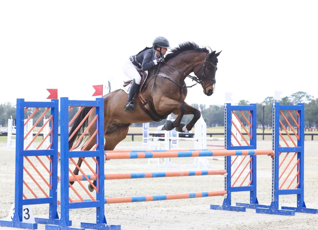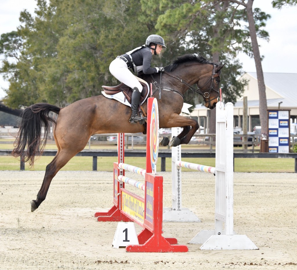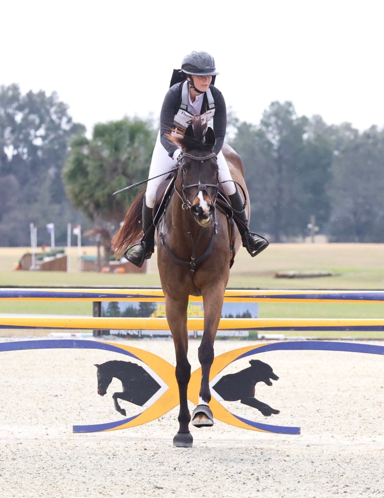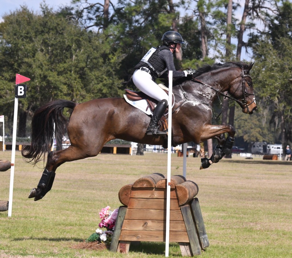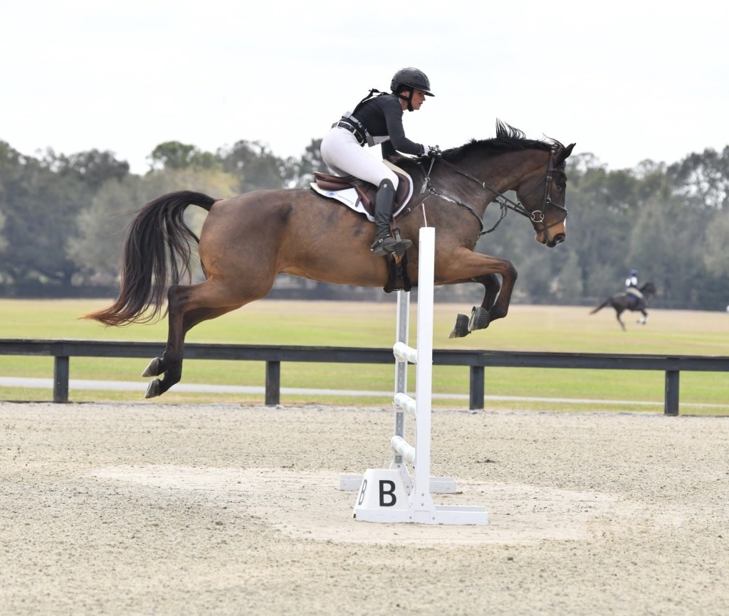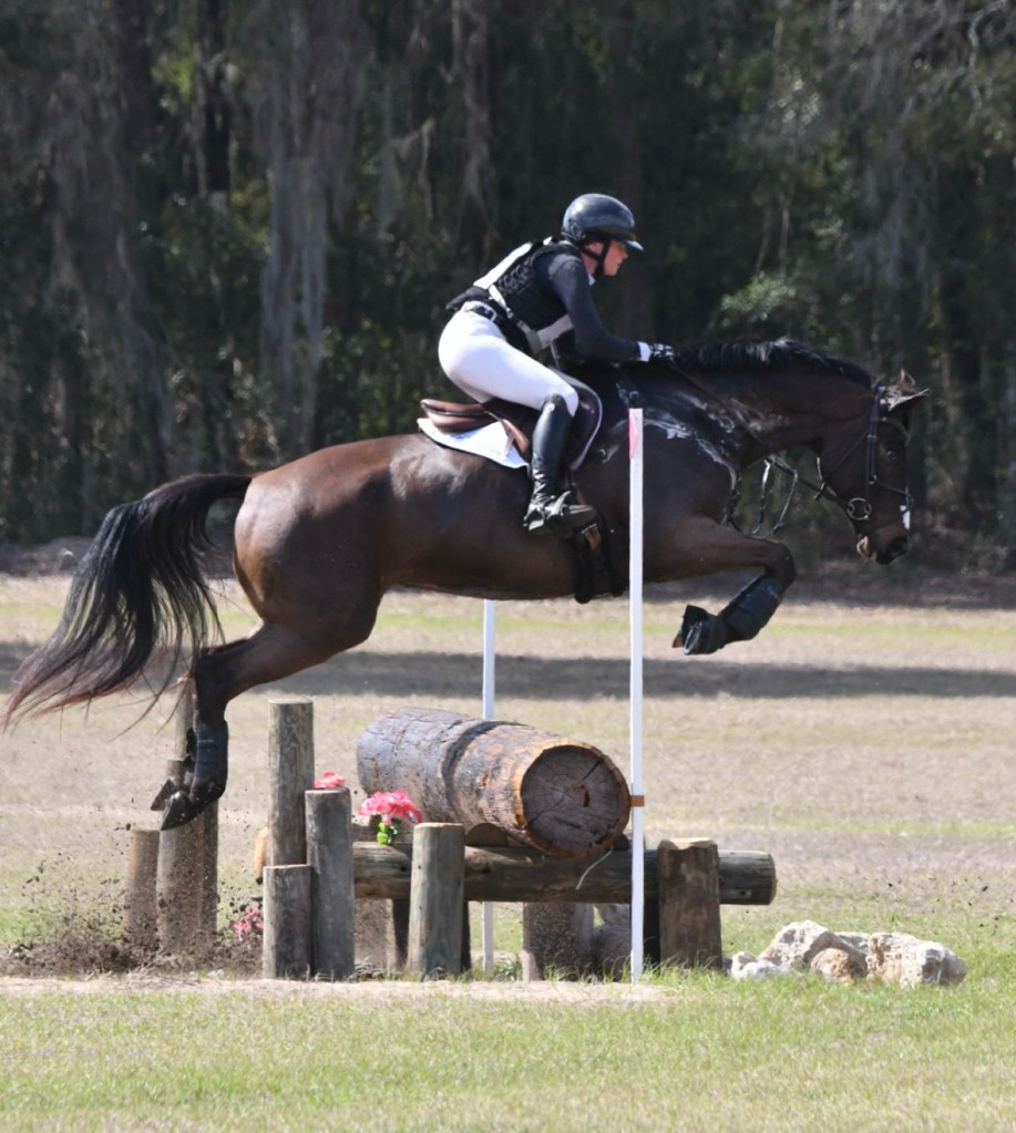 I kept him bent slightly to the left and busy all the way to 3, which included passing a truck and a flatbed that were on the treeline. To his credit, he didn’t even look at it. We jumped 3, and he was immediately so locked on to 4 that he did a little stumble through the footing change (there was a small depression/sandy spot there) and popped me out of my right stirrup. I was already too close to 4AB to go fishing for it, so I just jumped through the combo without it. He was superb. Clicked into heat-seeking missile mode, for sure.