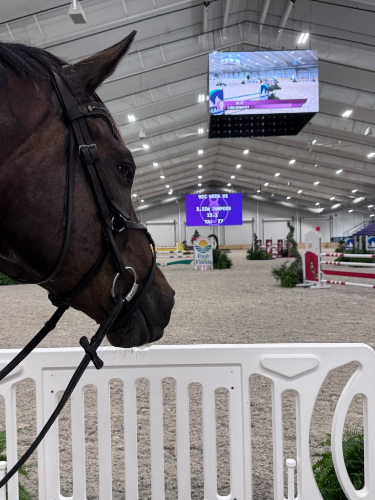 We had some time to kill (because when does jumperland ever run on time) which worked out great, honestly. He was definitely on his toes when he first went into the indoor, but he had time to sit and watch some horses go, and spend time just walking around. Which is right around the time I realized he really truly has never been in an actual INDOOR before. A couple small/bright covered rings, but a true indoor… I don’t think so. Especially not one like this. About 1/3 of the massive indoor is the warmup ring, then there’s a little alley made up of barricades in between the warmup and the show ring itself. There are bleachers on one side, lots of little exit doors on the sides and the end, plus jump crew sitting just behind the wall. Not to mention all the hoopla of the WEC decor, like the 700 trees and signs and shit that are all over the ring, and the jumbotron and the big scoreboard.