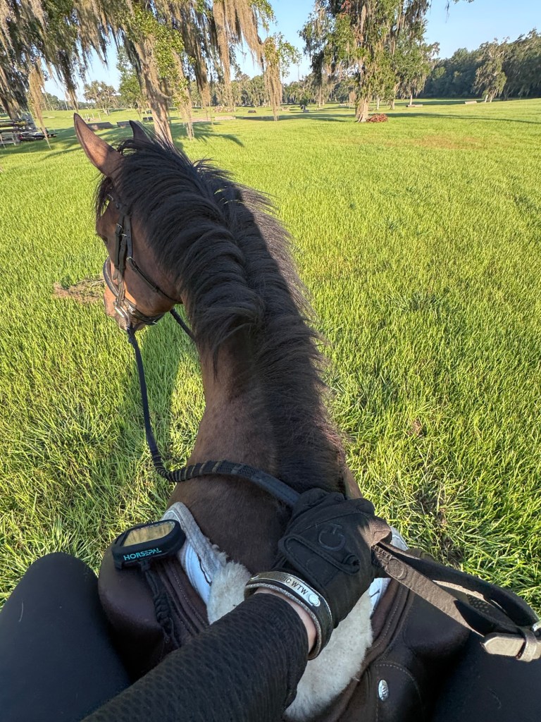He had the following day off, then a stretchy hack day followed by a flatwork day. On Sunday I took him over to Sweet Dixie bright and early for his weekly conditioning ride. It’s been mega hot and humid here, but it wasn’t too insufferable (your opinion may vary) yet at 7am, so off to the hill trots we went. I’m in the process of trialing the Horsepal heart rate monitor to review on Eventing Nation, and this was our maiden voyage. It took me about 5 minutes of stubborn “I don’t want to read the directions” fidgeting with all the various parts (it comes with lots of accoutrement) before I pulled up the “how to” video and was set up and ready to go within a few minutes. You’ll have to wait for the actual review but this one is different from the ones I’ve used in the past (Hylofit and Seaver) and the first test run was very promising.
