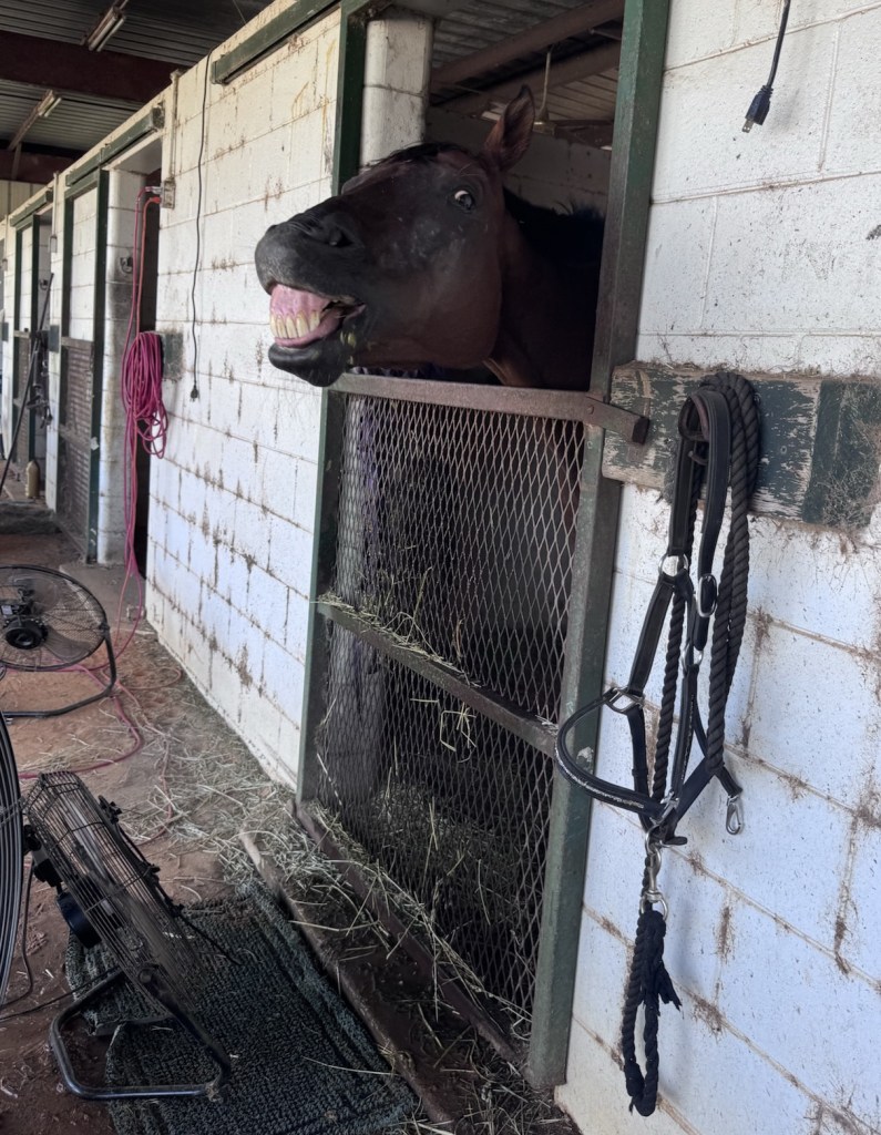 Henry’s also been having a little bit of downtime because it was legitimately just HOT AS ACTUAL HELL here last week and for most of this week. He doesn’t sweat well and I always hesitate to ride him on the super hot days because I don’t want to essentially “pre-heat” him for the day ahead. It’s hard enough to keep him comfortable in the afternoon. Although he got a new misting fan and has been considerably more comfortable with that. It makes a swampy mess, but he’s happy, so…