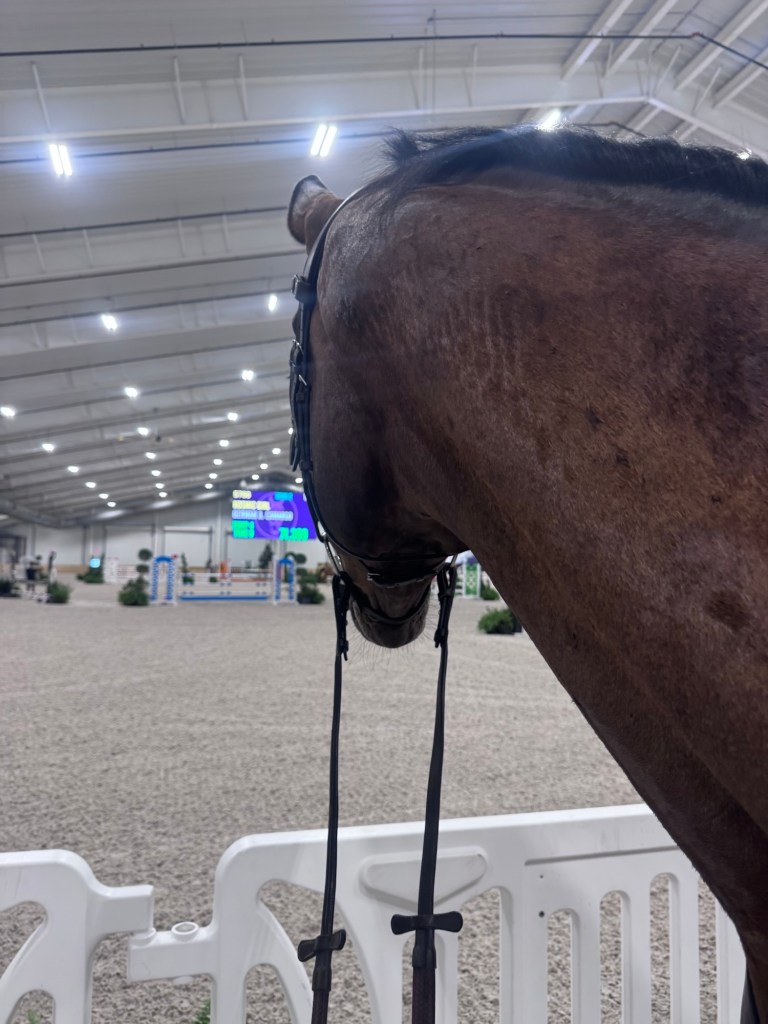 Yup, you’re reading that right – the 1.20m. Had he ever jumped a full course that big before? Def not at a show. I don’t really think at home either. But meh. She had two more horses in the class and he certainly wasn’t challenged at 1.15m, so why not (very easy to say when it wasn’t me riding – I would’ve shat my tan knee patch Jumperland breeches). For anyone keeping track, 1.10m is Prelim SJ height, 1.15m is Intermediate height, and 1.20m is Advanced height. I was kind of excited to see him jump around some bigger jumps since he’s literally never looked challenged at anything he’s met so far in his entire life.