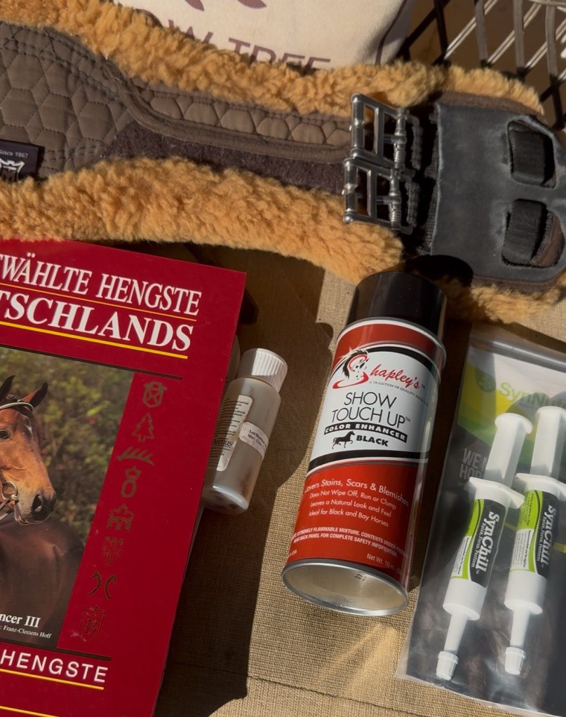 Otherwise it’s been the usual stuff happening around here, lots of working and horses and working and horses and rinse, wash, repeat. I have no complaints. We’ve also entered tack sale season, and I’ve gotten some good scores, like a couple free tubes of SynChill, some free black show spray, a pair of Equilibrium boots for $1, a bit for $3, a Mattes girth, and some REALLY cool old stallion books from Germany. Such a random but awesome find for a breeding nerd like me.